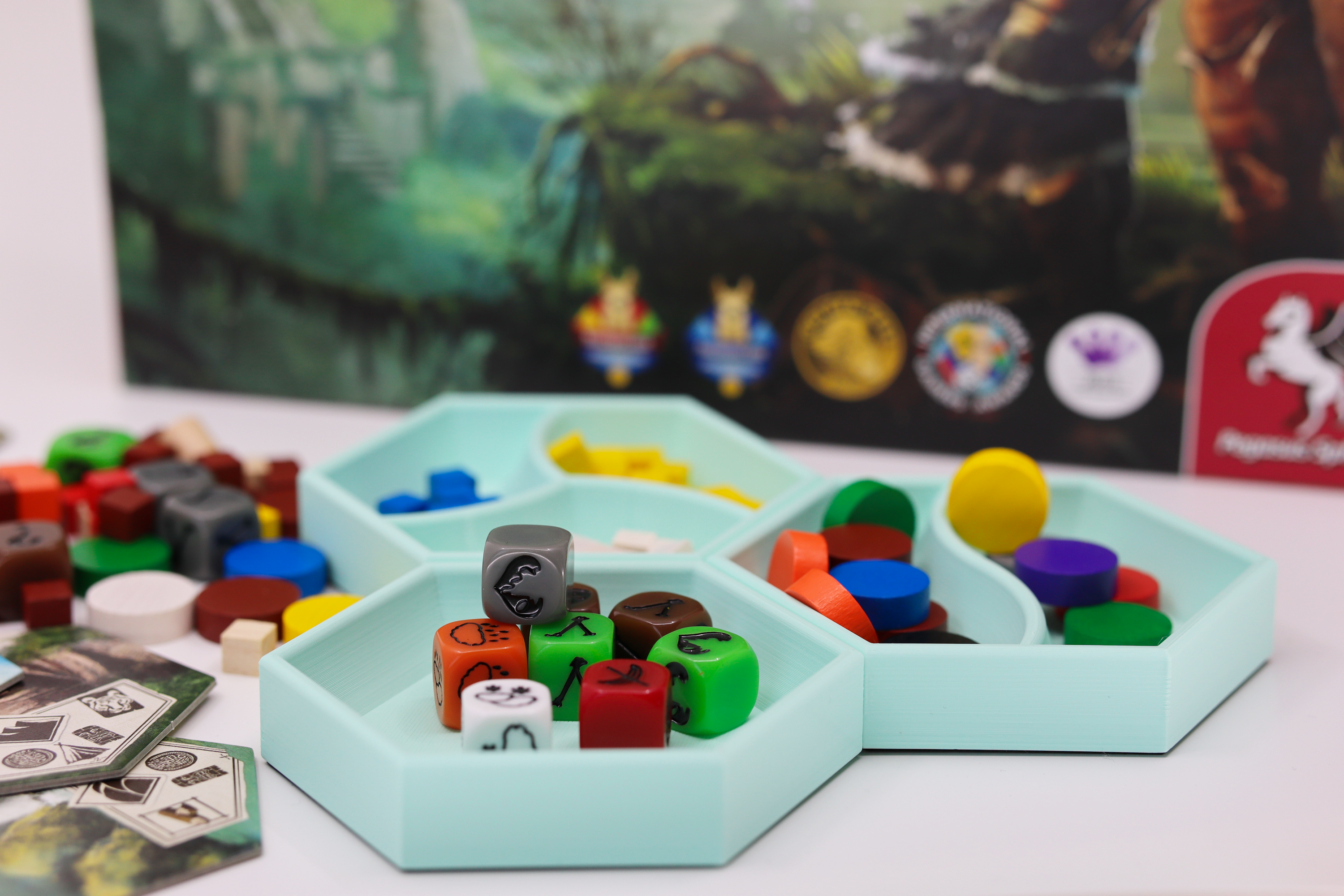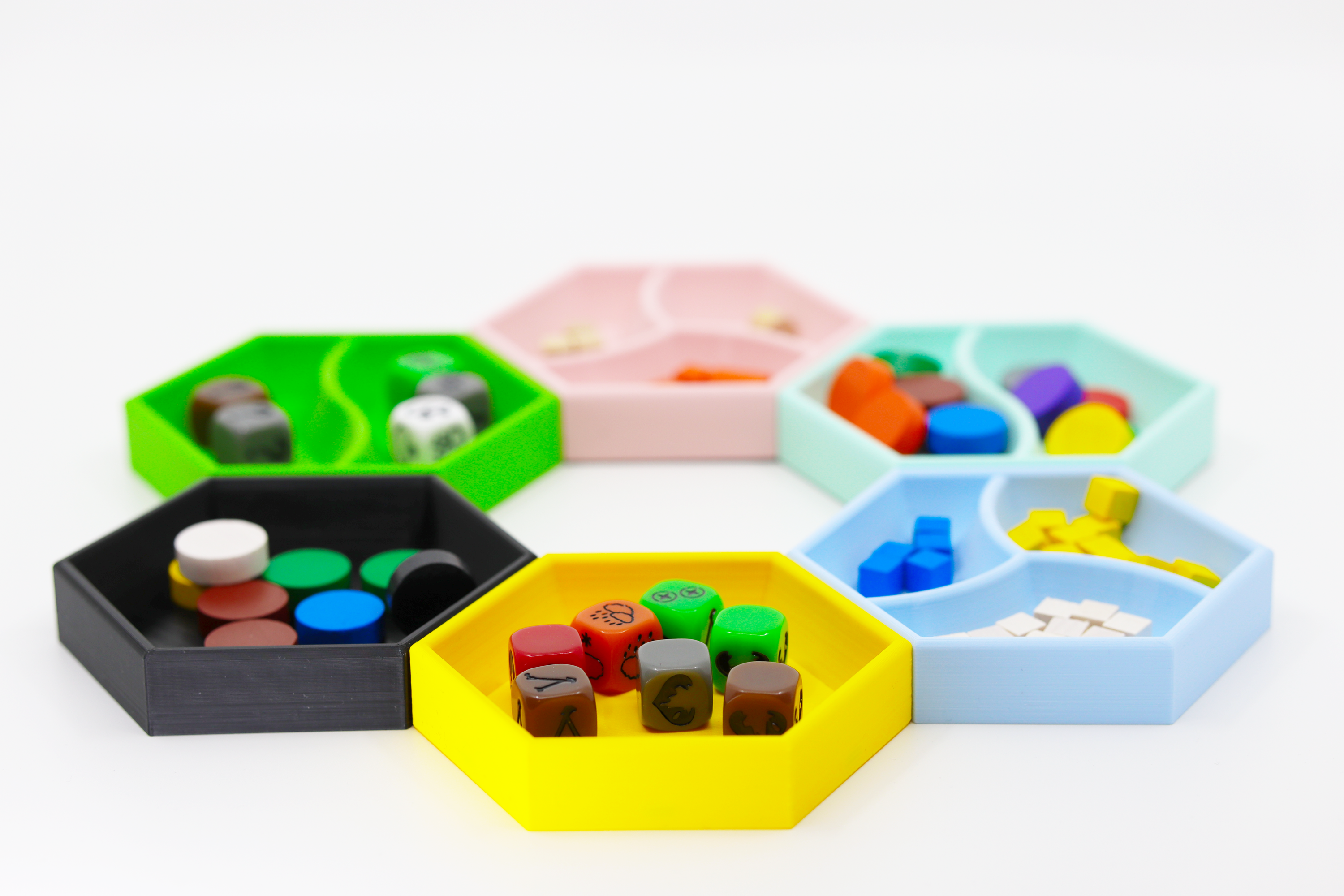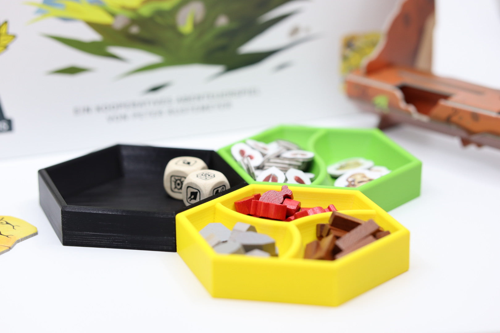 Hexpod Trays zum Organisieren und Sortieren von Spielzubehör.